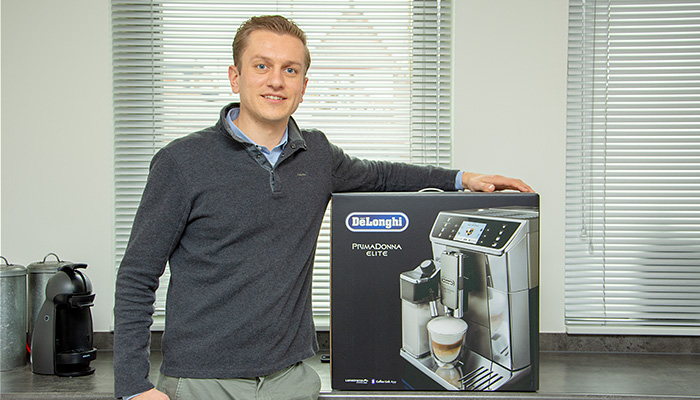Richard Vernooij zag de De'Longhi PrimaDonna Elite espressomachine een paar keer voorbijkomen op de Veilingen van Privileges. ‘Ik raakte steeds meer geïnteresseerd in het apparaat en ben recensies en review-filmpjes gaan bekijken. Ik wilde deze machine gewoon hebben, maar dat heeft me wel wat moeite gekost. Hij was al twee keer aan mijn neus voorbij gegaan toen ik besloot niets meer aan het toeval over te laten. Ik mijnde hem uiteindelijk iets boven mijn streefbedrag. Zo blij dat ik hem eindelijk te pakken heb!’ ‘Mijn vriendin Gabrielle en ik hadden thuis een koffiezetapparaat met cups. Maar ik vind het verbruik van plastic cups zonde en ook nog eens erg duur’, legt Richard zijn keuze voor de volautomaat uit. ‘Nu hebben we een luxe bonenmachine die bovendien een veel beter kopje koffie zet. De smaak is heel goed. We hebben inmiddels allebei onze eigen instellingen bepaald zodat we beiden het ideale kopje koffie drinken.’ Gabrielle en Richard waren beiden thuis op het moment dat de chauffeur van Privileges de De’Longhi kwam bezorgen. ‘We hadden de machine al de dag van aankoop in huis kunnen hebben, maar ik ben it-consulent en was op zakenreis. We hebben daarom een ander bezorgmoment afgesproken zodat we samen het apparaat meteen konden uitproberen.’ Richard woont in het dorp Lent, vlakbij Nijmegen. Via zijn vriendengroep werd hij in 2012 lid van Privileges. ‘Veel van mijn vrienden zijn al jaren lid. Zij hebben mij enthousiast gemaakt voor de Veilingen. Op mijn beurt vertel ik graag over mijn aankopen aan andere mensen. Wie weet kan ik hen ook lid maken.’